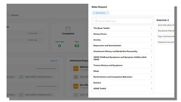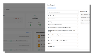 Select from 55+ online history forms, questionnaires, and informant collateral for client mental health assessments for ADHD, anxiety, depression, trauma history, PTSD, autism, and more.