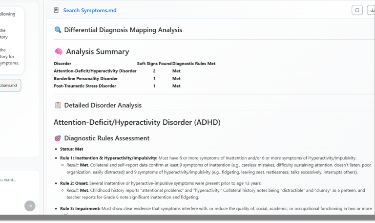 Document and summarize the client's history, questionnaires, and collateral responses into your reports. Leveraging our clinical rules and the soft signs / symptoms data, Sasha speeds the report writing process.